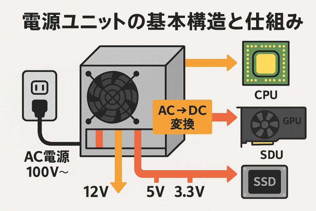 パソコンの電源ユニット(PSU)は、見た目こそただの「黒い箱」に見えるかもしれませんが、中ではとても大事な“変身”が行われています。