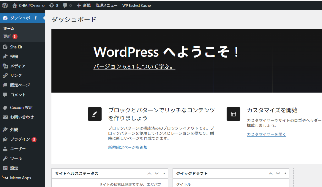 ログインすると、WordPressのダッシュボードが表示されます。ここが、あなたのサイトの「操作本部」のような場所です。