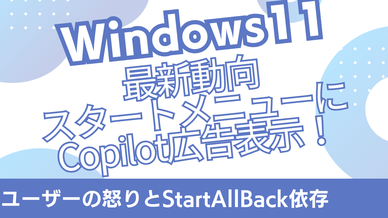 本記事では、Windows 11の最新動向として「スタートメニューへのCopilot広告表示」と「StartAllBack依存の現実」を取り上げ、実際のユーザーの声や懸念点を整理して解説していきます。