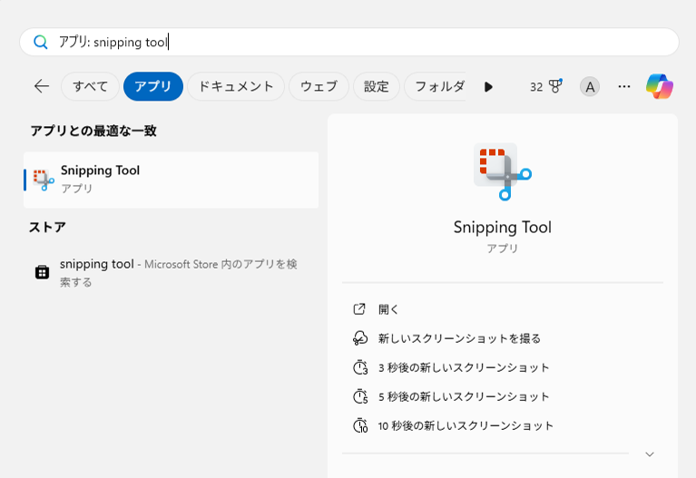 スタート → 「すべてのアプリ」 → 「Snipping Tool」をクリック。 - ショートカットキーで起動(おすすめ)